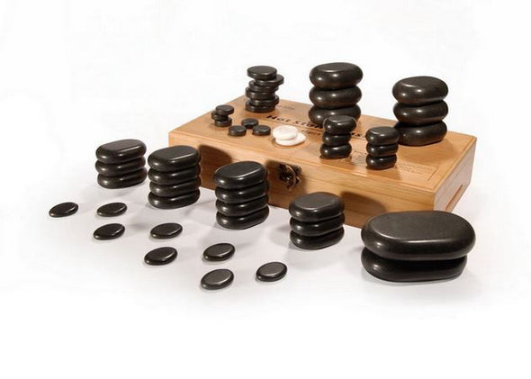 Set includes: 2 Extra-Large Flat Ovular Basalt Stones, 6 Large Flat Ovular Basalt Stones, 14 Medium Flat Ovular Basalt Stones, 6 Small Flat Ovular Layout Basalt Stones, 6 Small Round Facial Basalt Stones, 8 Toe Stones, 6 Small Circular working Basalt Stones, 2 Small Ovular White Marble Stones.